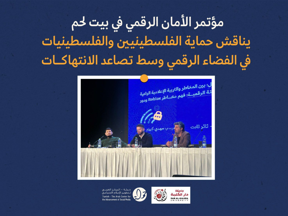 28 كانون الثاني 2026، اختتم حملة - المركز العربي لتطوير الإعلام الاجتماعي، بالشراكة مع جامعة دار الكلمة، مؤتمر الأمان الرقمي الذي عُقد أمس الثلاثاء في حرم الجامعة بمدينة بيت لحم تحت عنوان "أمننا الرقمي مستقبلنا: الفضاء الرقمي بين الحرية والأمان" بمشاركة نخبة من الخبراء والخبيرات والحقوقيين/ات والباحثين/ات في قضايا الحقوق الرقمية، وحضور ما يقارب 200 مشارك/ة من طلبة الجامعات والنشطاء/الناشطات والمهتمين/ات بالحقوق الرقمية. وجاء المؤتمر في ظل تصاعد الانتهاكات الرقمية بحق الفلسطينيين/ات وتنامي المخاطر التي تهدد سلامتهم/ن وحقوقهم/ن في الفضاء الرقمي، لا سيّما ما يتعلق بسلامة الأطفال، والعنف الرقمي القائم على النوع الاجتماعي، والحق في الخصوصية والتعبير، إلى جانب بحث سبل الحماية والمناصرة وبناء سياسات رقمية عادلة وآمنة.