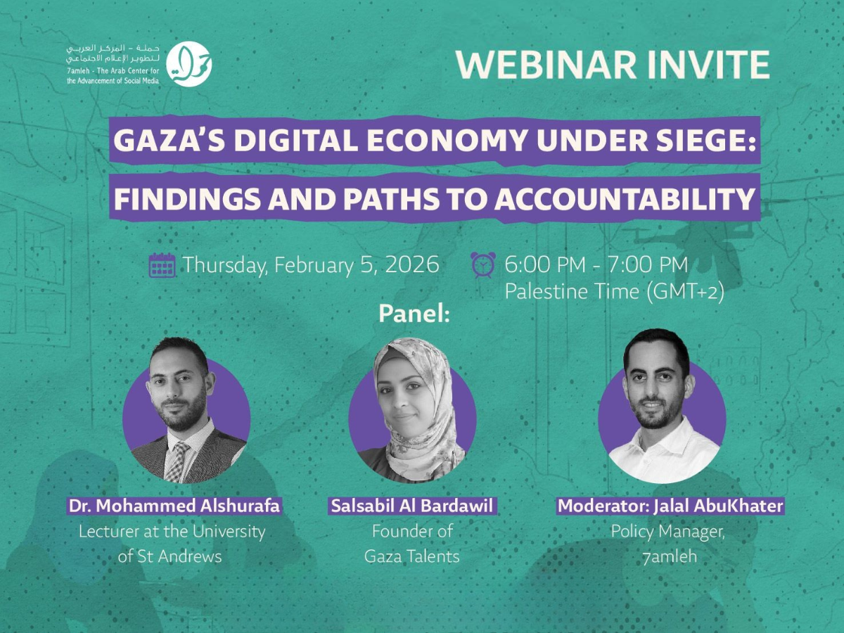 7amleh invites you to a webinar on the collapse of Gaza’s digital economy under blockade and the destruction of telecommunications infrastructure. Join Dr. Mohammed Alshurafa, author of the newly published report, as he shares key findings and testimonies from Gaza’s digital workers, and reflects on what the loss of connectivity means for livelihoods, survival, and recovery.